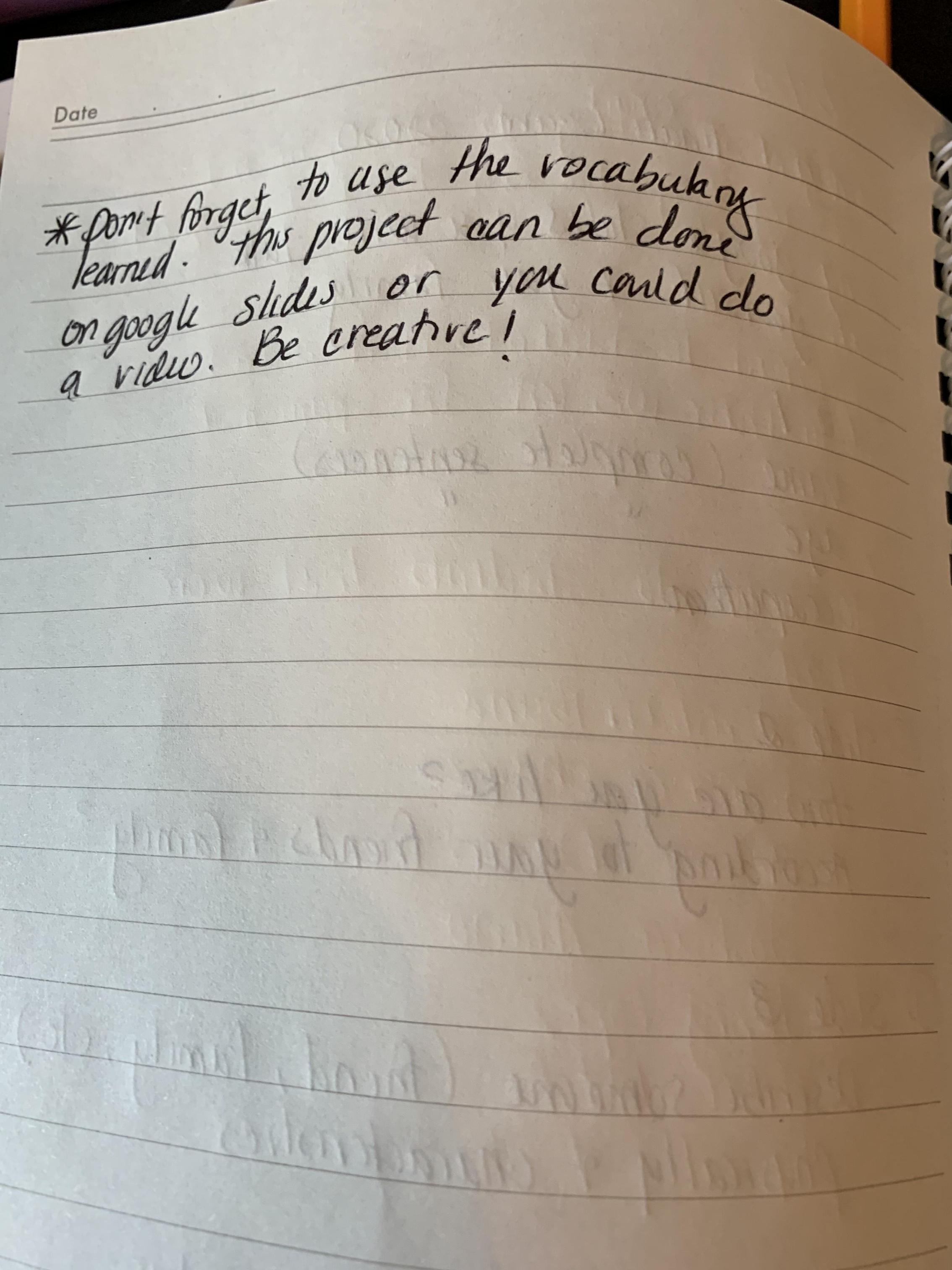 1. Final : Project is due on June 1st. Don't forget that you need six slides and pictures on every slide. You could be on every slide if you like. Must be in Spanish.