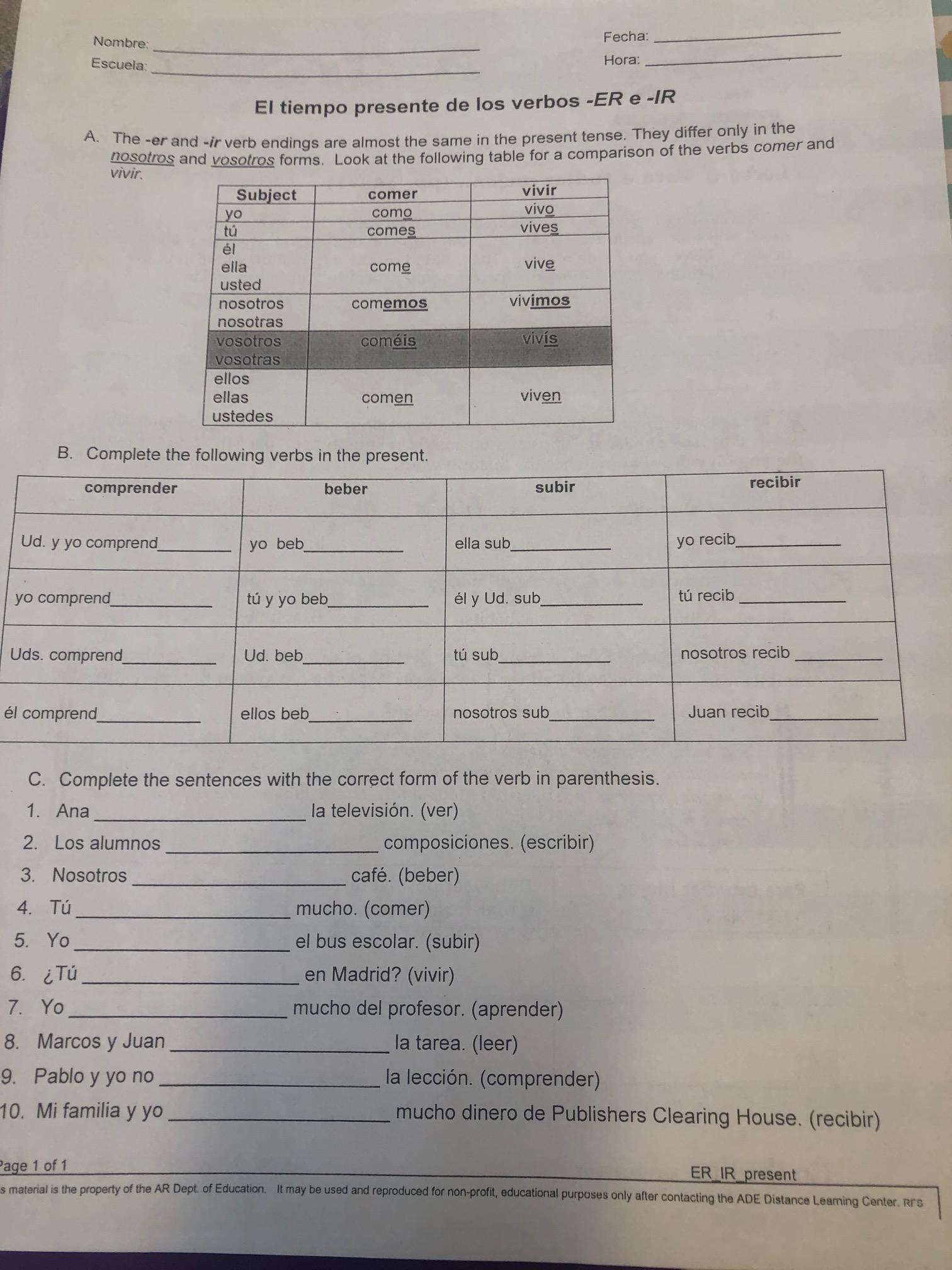 Homework: El tiempo presente de los verbos -er y -ir. Copy chart for B and write out sentences for C.